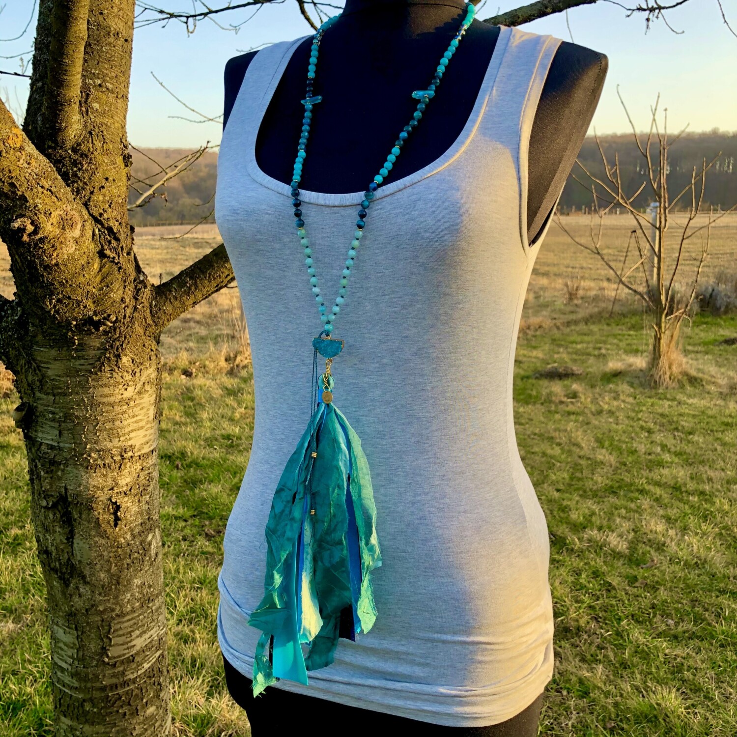 Szinte siklik és libben ez a könnyed, üdeséget és könnyedséget idéző türkiz kék megannyi árnyalatában tobzódó 108 szemes mala. A guru szem alatt nagyobb összekötő gyönyörű türkiz druzy acháttal fontam össze a hatalmas ponge selyem, tépett szálas bojt