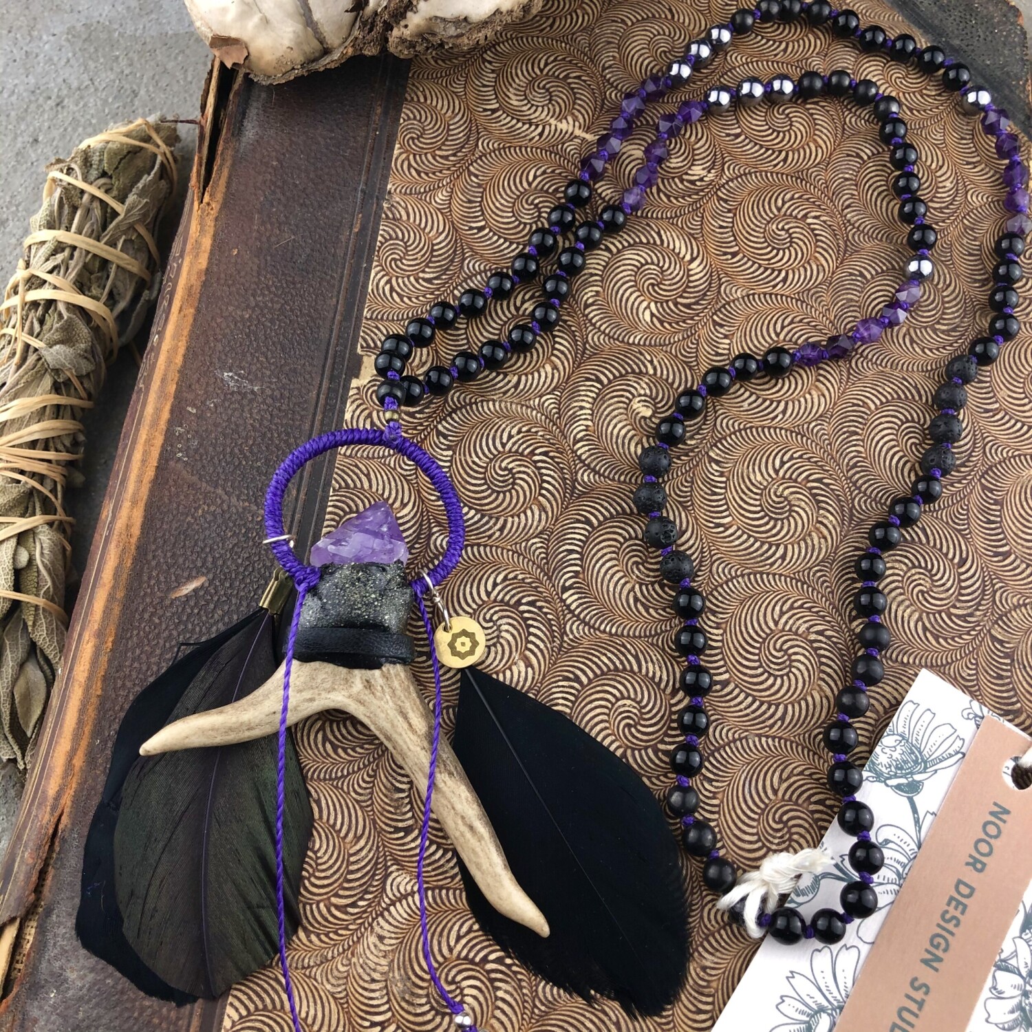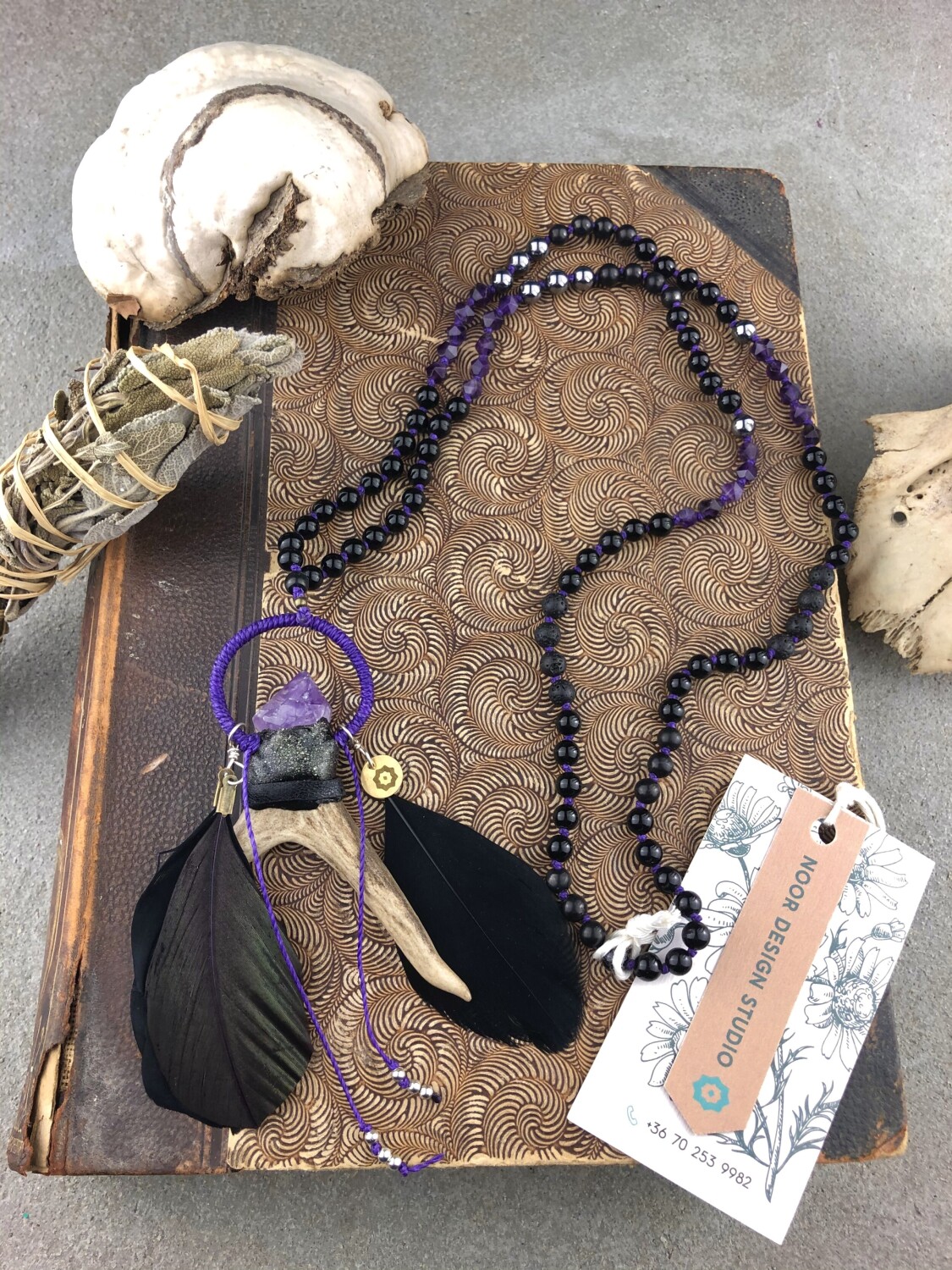 Sámánisztikus, még is nőies amulett mala készült két ágú őz agancsból, fekete és lila lúdtollakból. Kurukulle Istennő erőterébe beavatva, csomózáskor 108x kántálva a mantráját. 108 szemes füzérben: polygon formájú ametiszt, szilicium, sungit, fekete