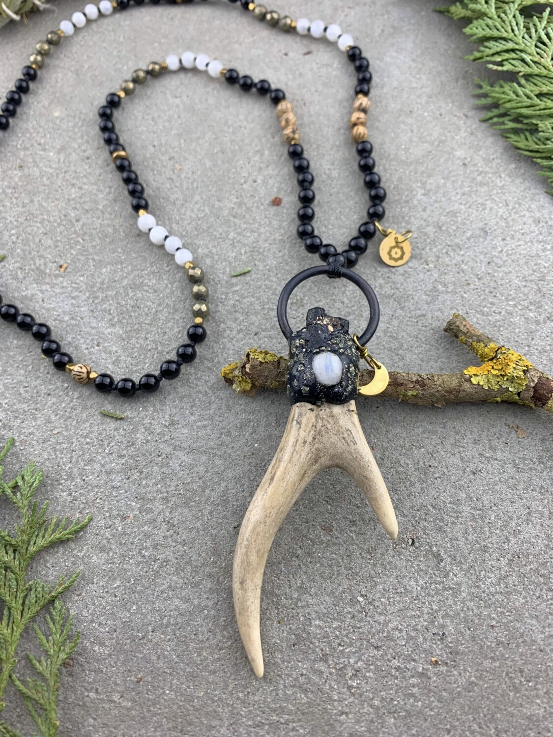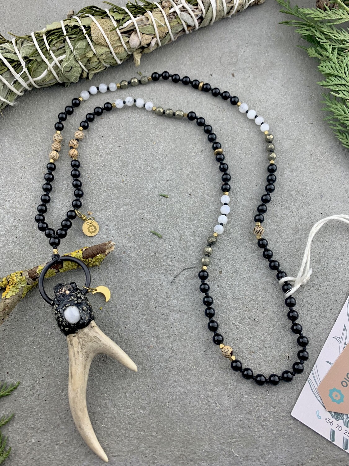 Erős még is nagyon nőies, produktivitást segítő agancsos malát készítettem. Gyönyörű, világos, két ágú őz agancsból készült, holdkő berakással és fekete turmalinnal, mely pirit ködbe bújt.