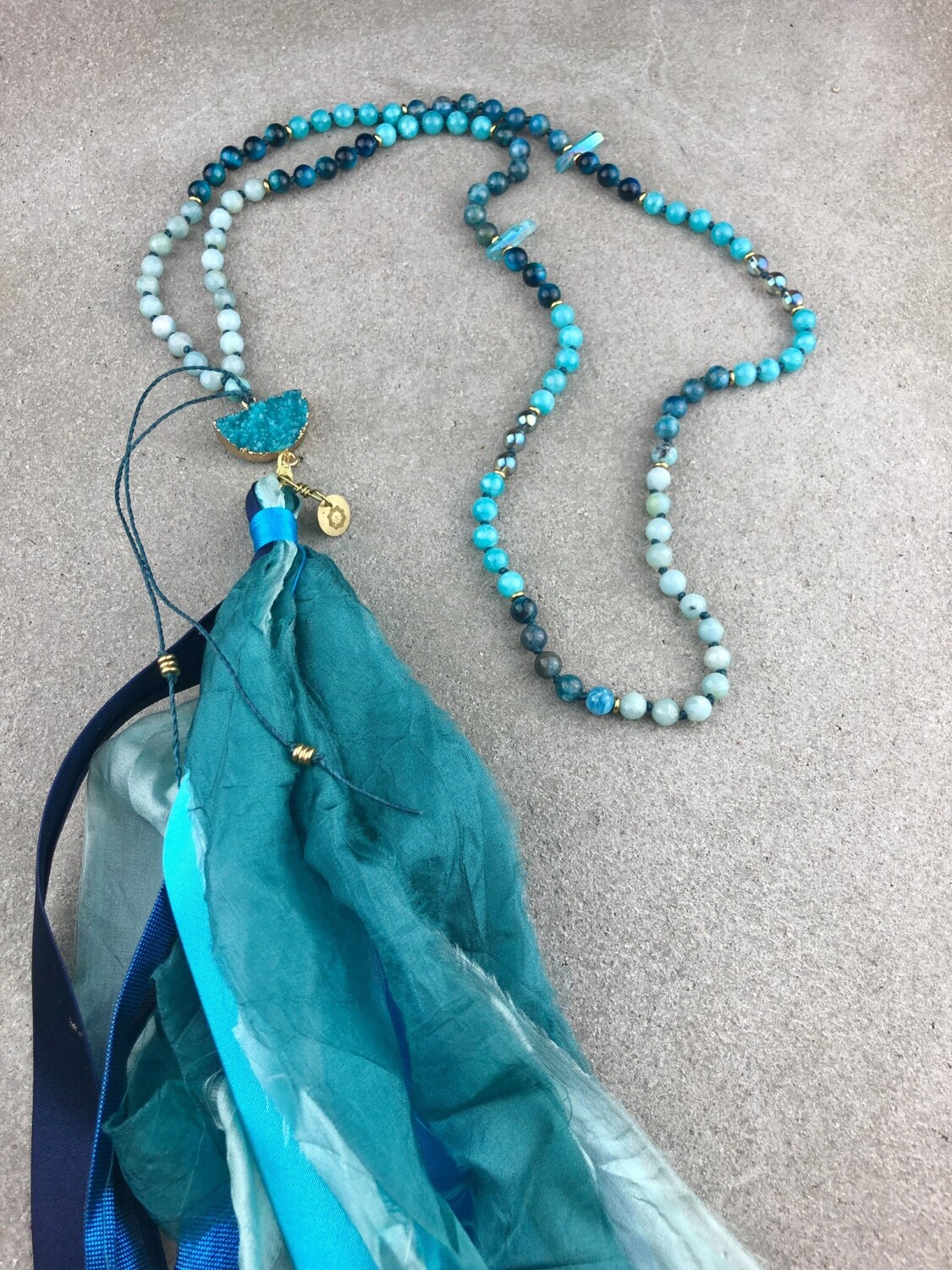 Szinte siklik és libben ez a könnyed, üdeséget és könnyedséget idéző türkiz kék megannyi árnyalatában tobzódó 108 szemes mala. A guru szem alatt nagyobb összekötő gyönyörű türkiz druzy acháttal fontam össze a hatalmas ponge selyem, tépett szálas bojt