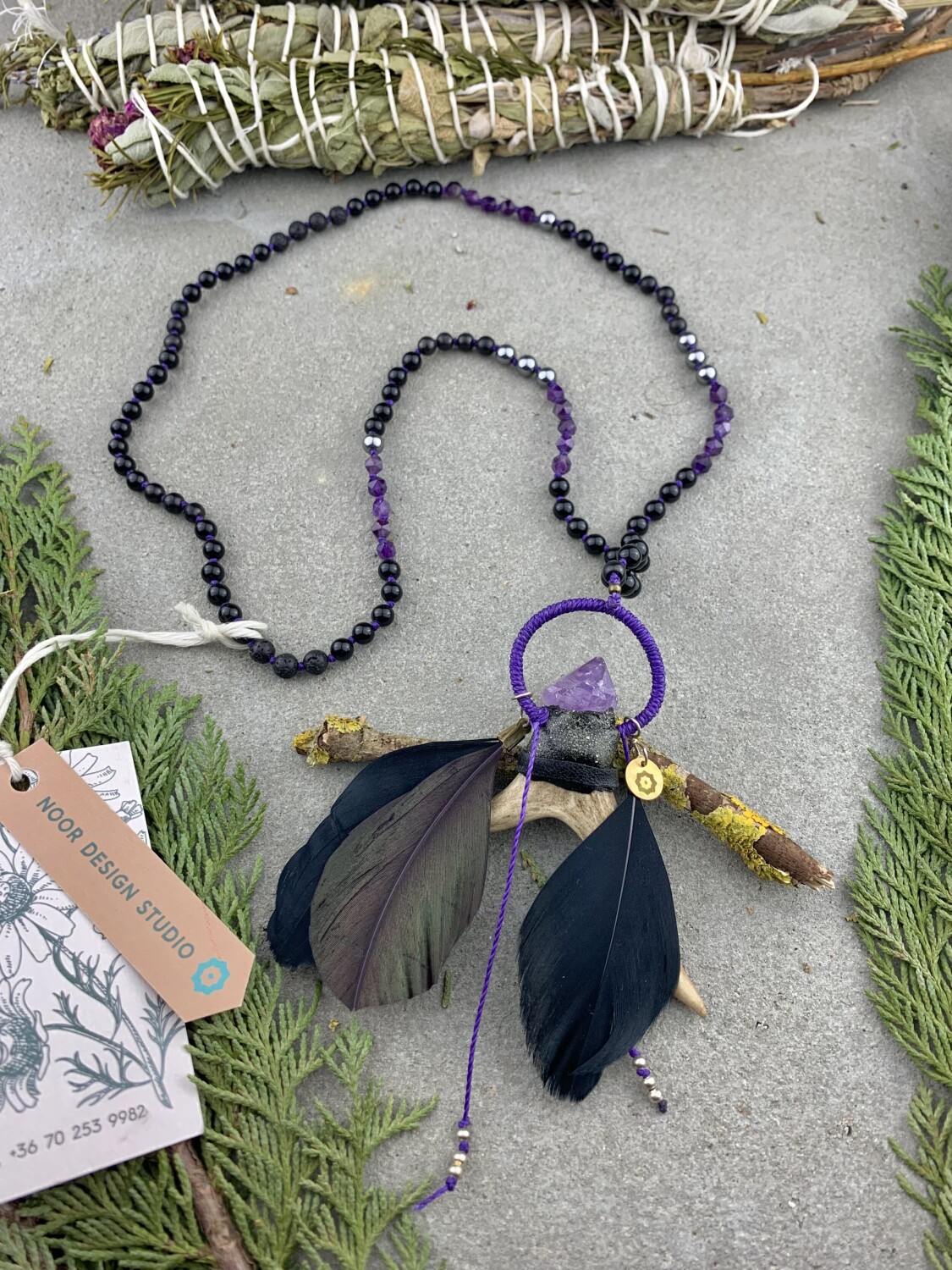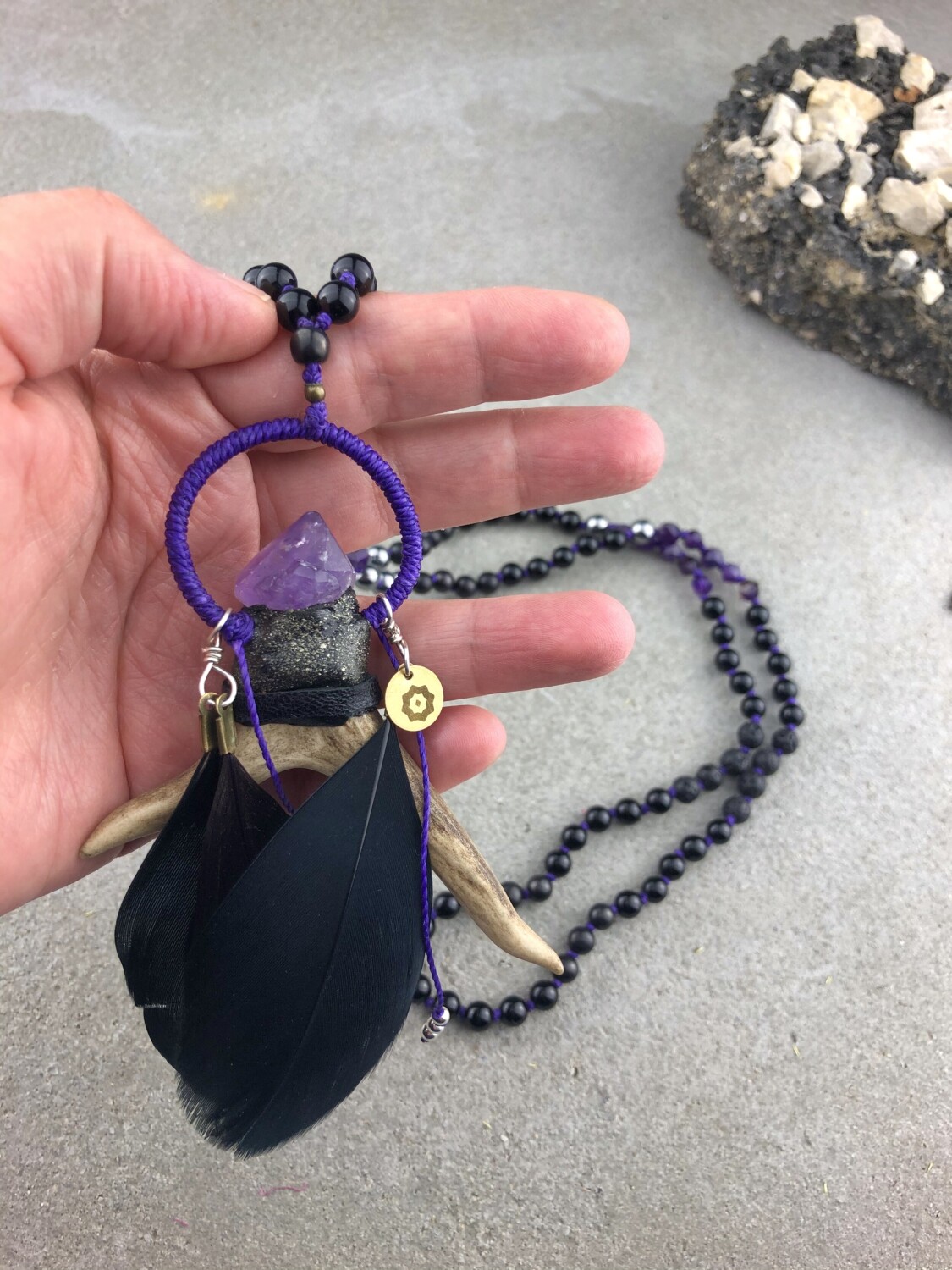 Sámánisztikus, még is nőies amulett mala készült két ágú őz agancsból, fekete és lila lúdtollakból. Kurukulle Istennő erőterébe beavatva, csomózáskor 108x kántálva a mantráját. 108 szemes füzérben: polygon formájú ametiszt, szilicium, sungit, fekete